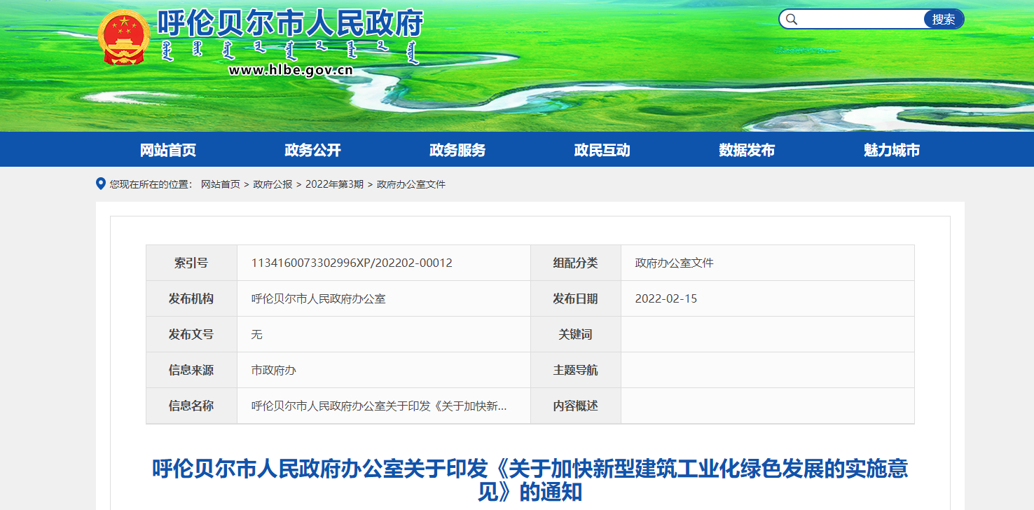 2022年裝配式建筑占比力爭達到15%,以后逐年提高,到2025年,裝配式建筑面積占比力爭達到30%。2023年起,新建裝配式建筑要全面實行裝配式全裝修,到2025年,呼倫貝爾市中心城區(qū)商品房裝配式裝修率力爭達到30%以上,旗市商品房裝配式裝修率力爭達到15%以上。